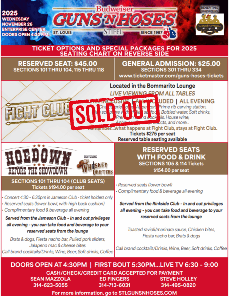 Guns ‘N Hoses is presented by the nonprofit St. Louis Guns ‘N Hoses Boxing Association and is sponsored by Budweiser and Grey Eagle Distributors, the Anheuser-Busch wholesaler in St. Louis County. Since its inception in 1987, Budweiser Guns ‘N Hoses has raised approximately $13 million to benefit The BackStoppers, a nonprofit organization that assists families of first responders who have died in the line of duty or suffered a catastrophic injury. 100% of donations go to The BackStoppers.